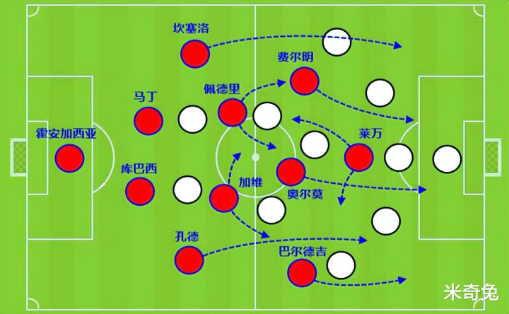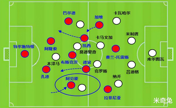 弗里克从阵型上看,似乎是4231,中场没有像巴萨传统那样放2个进攻型的中前卫,反倒是有2个后腰,感觉上不利于进攻。