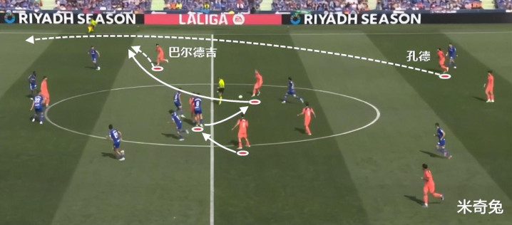 弗里克的巴萨,在中圈倒球的质量挺高的,关键是边路拿球之后,边后卫套上会非常快。所以弗里克对孔德要求,就是不断地上下跑动。