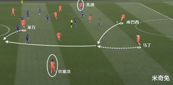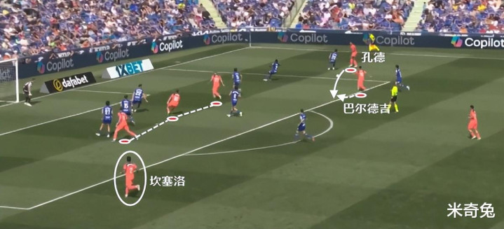 这一次的进攻很典型,巴萨一侧边锋内收时,边后卫就要跟边锋一样拉开宽度。孔德的特点,是更合适边锋拿球后,他无球套上外线接应,所以他相对靠后一点,但不等于说孔德不参与进攻。